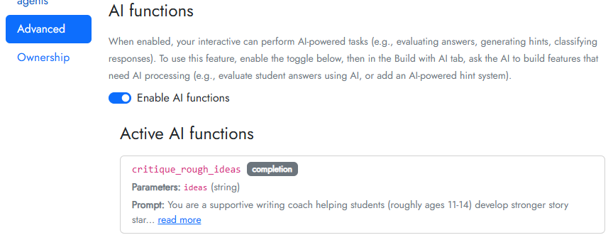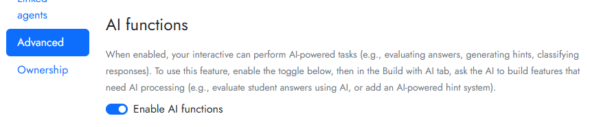 Interactive mini apps are already pretty powerful by themselves, but you can also allow your mini app to engage with AI to provide live, reasoned responses to students. One way is to link a pre-existing agent into your Interactive. Another way is to activate and use AI functions in your mini app.