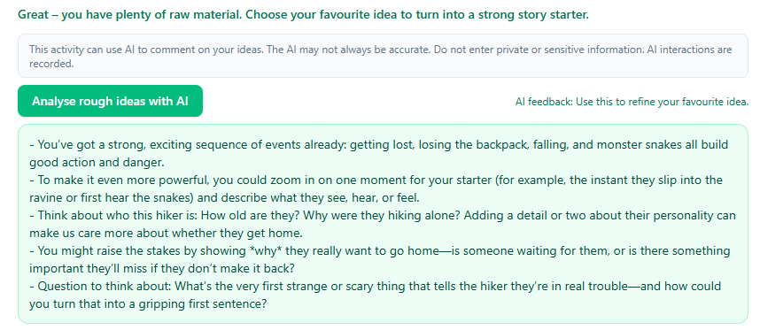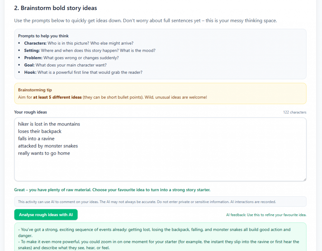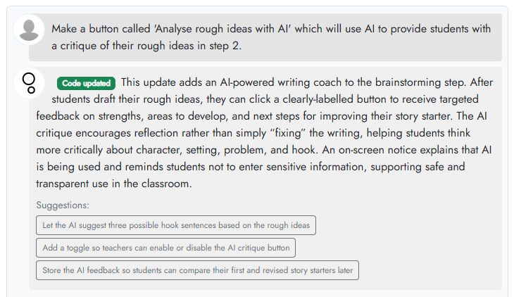 In the Build with AI tab, enter something you’d like an AI response for. For example, in a mini app where students need to come up with story ideas, you might tell the AI builder: “Make a button called ‘Analyse rough ideas with AI’ which will use AI to provide students with a critique of their rough ideas in step 2.”