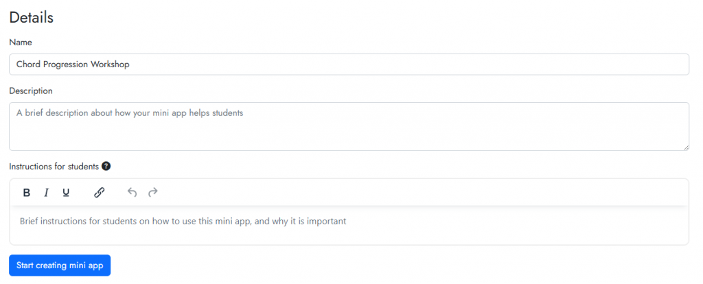 You can make your mini app available to others through a direct link (in the Access tab), or you can embed the mini app into an LMS via LTI.