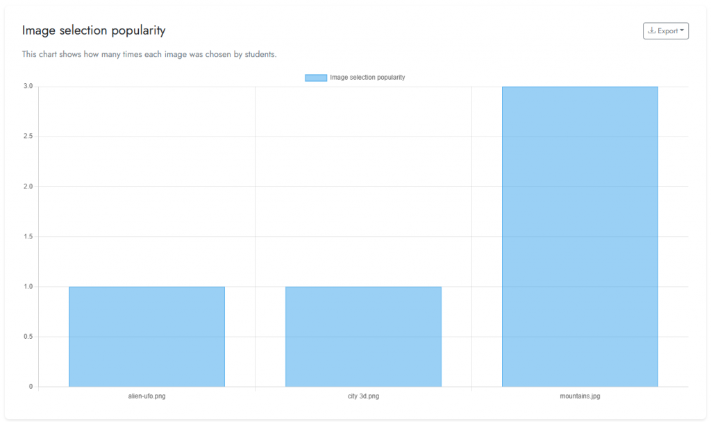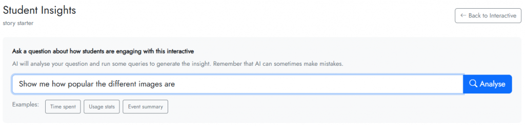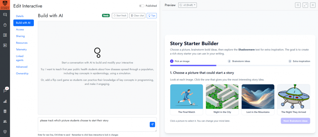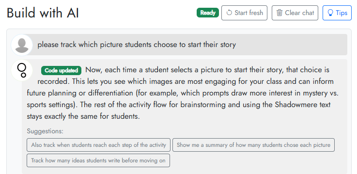 In the Build with AI tab, tell the AI builder what you would like to ‘track‘. In the example below, we are asking, “please track which picture students choose to start their story“.