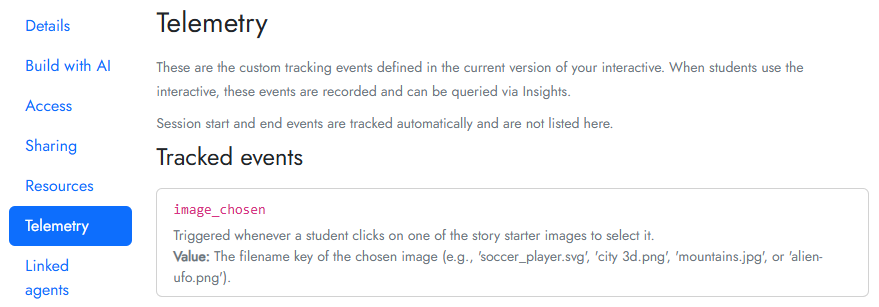 You can see the events or details that your Interactive is tracking by clicking on the Telemetry tab. For example, the above request added the ‘image_chosen’ telemetry event to this mini app: